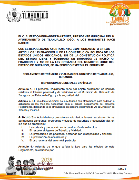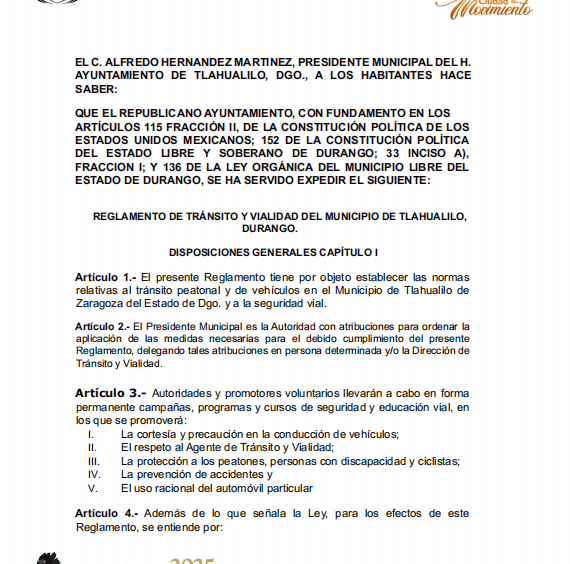 Reglamento de Transito y Vialidad de Tlahualilo, Dgo., Administración 2025-2028